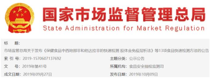 市場監(jiān)管總局關(guān)于發(fā)布《保健食品中西地那非和他達拉非的快速檢測 膠體金免疫層析法》等13項食品快速檢測方法的公告