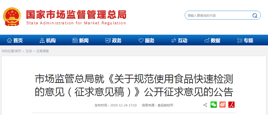 依據(jù)《中華人民共和國食品安全法》有關(guān)規(guī)定,市場監(jiān)管總局起草了《關(guān)于規(guī)范使用食品快速檢測的意見》(征求意見稿),現(xiàn)向社會公開征求意見。歡迎各有關(guān)單位和個人提出修改意見,并于2020年1月2日前反饋市場監(jiān)管總局。公眾可通過以下途徑和方式提出意見。