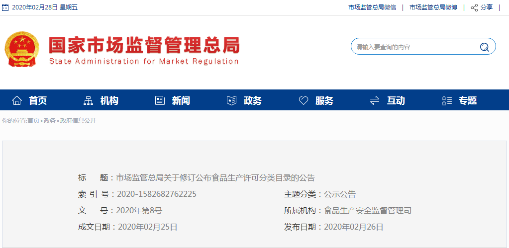 市場監(jiān)管總局關(guān)于修訂公布食品生產(chǎn)許可分類目