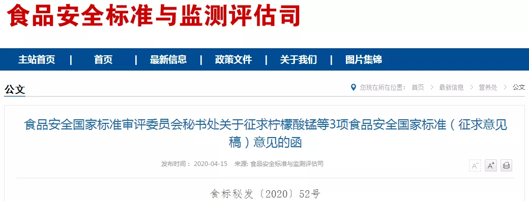根據(jù)《食品安全法》及其實(shí)施條例規(guī)定,我委組織起草了《食品安全國家標(biāo)準(zhǔn) 檸檬酸錳》等3項(xiàng)食品安全國家標(biāo)準(zhǔn)(征求意見稿),現(xiàn)向社會公開征求意見。請于2020年6月6日前登錄食品安全國家標(biāo)準(zhǔn)管理信息系統(tǒng)(